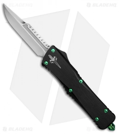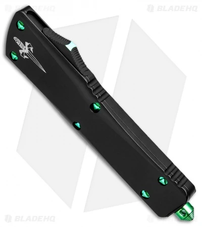 The Marfione Custom Combat Interceptor automatic knife features an Interceptor style blade with the handle and firing power of a Combat Troodon. This Combat Interceptor has a hand finished satin M390 steel blade. It has a black anodized 6061-T6 aluminum handle with green hardware. The model, date, and Marfione Dagger are found on the pocket clip. Includes a certificate of authenticity.