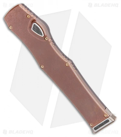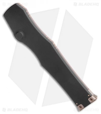 This Marfione custom Halo VI has a Hellhound Tanto blade with a mirror polished finish. Its handle is made from Mil-Spec anodized alloy and copper with bronze titanium hardware, and has no integrated safety on the push button. The charging handle comes marked with the Marfione Dagger and date of creation.