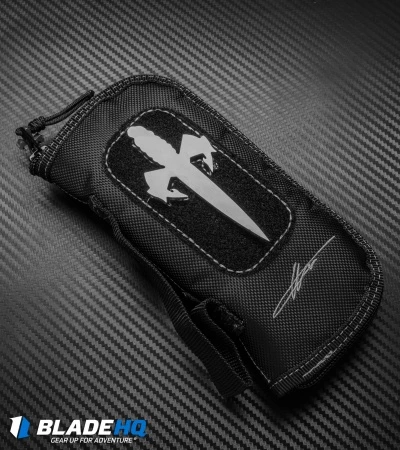 This bronzed aluminum model features a lightning strike carbon fiber lever and DLC finished internals. It measures 3.9″ with lever down. The pocket clip is marked with the Marfione Dagger, model name, and date of production.