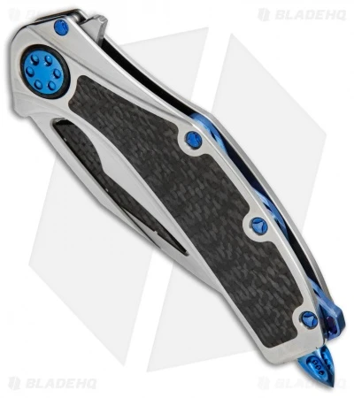 This Marfione custom Super Matrix-R features a hand ground blade made from M390 steel with a mirror polished finish and a carbon fiber inlay. The handle is hand rubbed satin finished titanium with carbon fiber inlays and blue anodized titanium hardware. The pocket clip is marked with the Marfione Dagger and a production date of 03/2017. A true collectors piece. Includes zipper case, certificate of authenticity, and Marfione Custom Knives box.