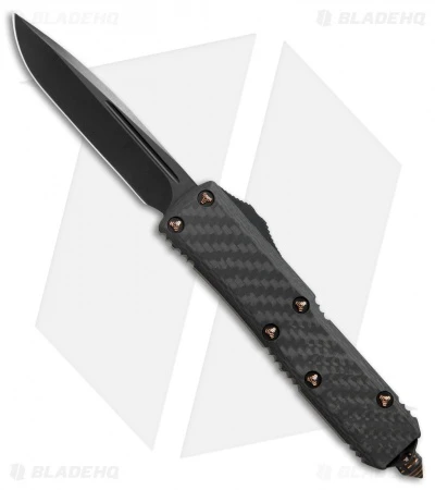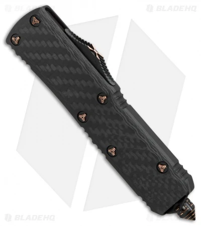 This Marfione Custom UTX-85 features a Bohler M390 blade with a DLC stonewash finish. It has a Mil-Spec anodized alloy handle with a carbon fiber top scale and copper ringed hardware. The clip is marked with serial number, Marfione Dagger, date of production, and model.