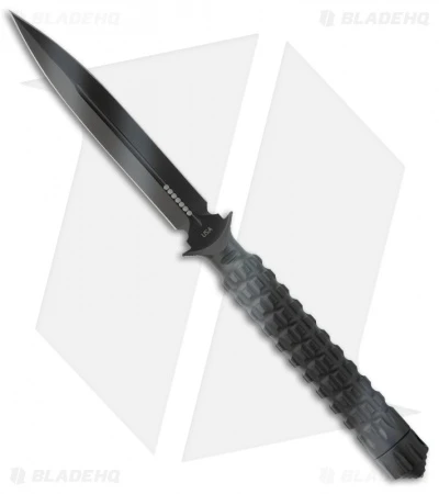 The A.D.O. (Alpha Detachment Operative) is an extraordinary fixed blade knife from Microtech. This ADO features an urban camo finished double-edge dagger blade (plain) and handle with a waffle-style texture. This knife follows the design of Chris Reeve fixed blades with a hollow handle, accessed by unscrewing the glass breaker tip. It is made from a solid billet of stainless steel. The A.D.O. includes a composite sheath with a spring loaded tab to secure knife and a 2″ steel clip for belt carry.