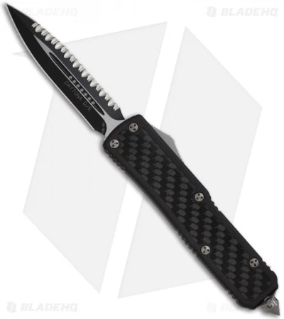 The Microtech Daytona is an impressive double action out-the-front automatic knife! This Daytona has a two-tone black finished S35-VN steel dagger blade with one fully serrated edge. The handle is black anodized aluminum with polished carbon fiber inserts on front and back. The sturdy pocket clip has the serial number and Microtech logo. Includes glass breaker.