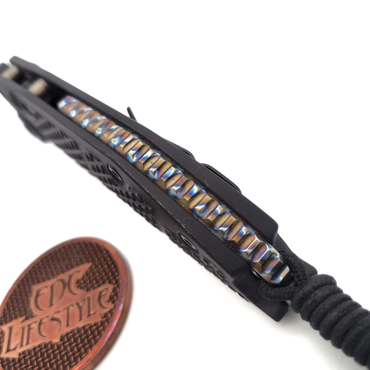 Rare Flamed Back Spacer Auto Stitch with DLC Blade made for the USN show. Â Item is used and comes with a generic Microtech box.