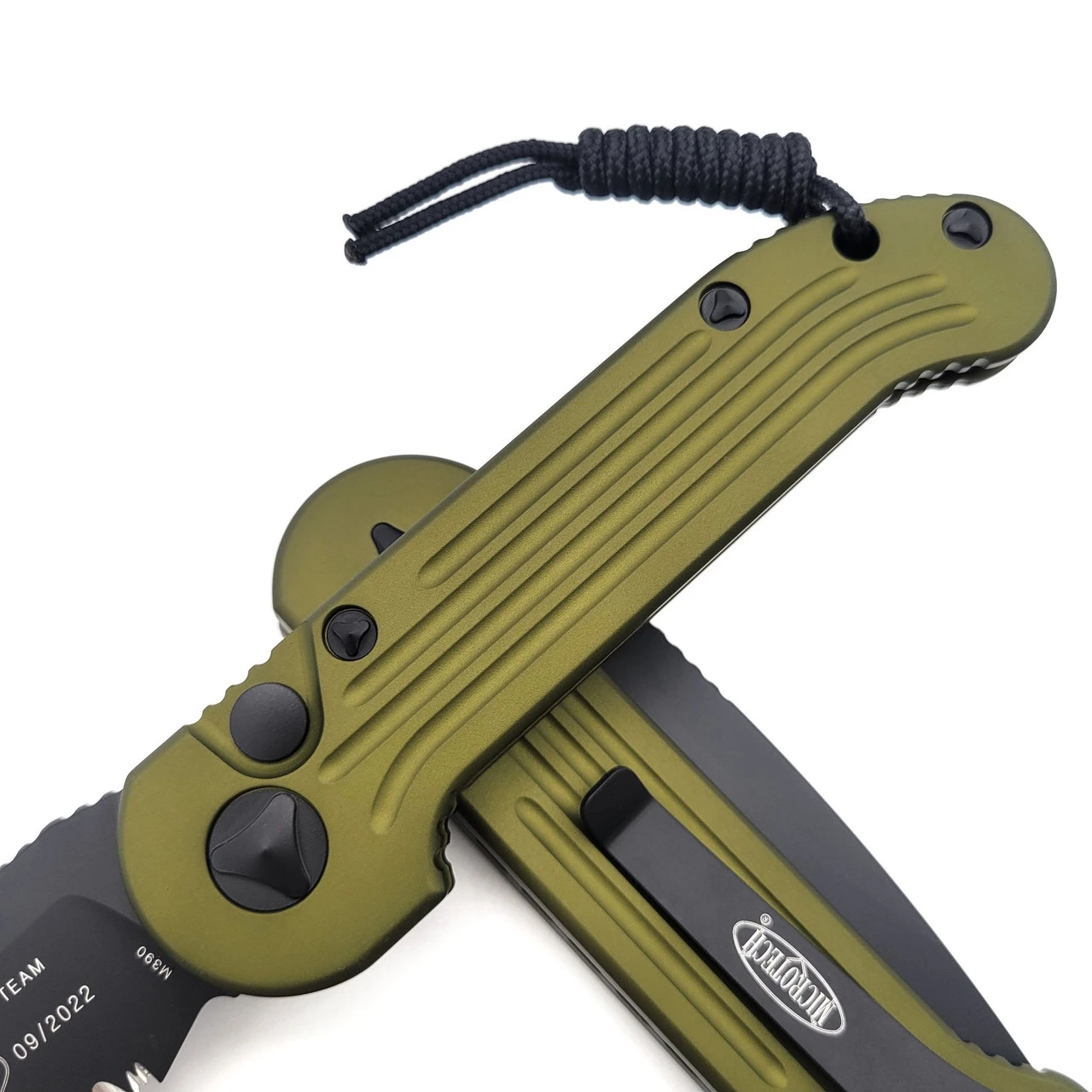 As pioneer of the Microtech® folding knife line, the UDT was created in 1995 and has evolved to be an exceptional combination of form and function. The first prototype models featured rubber Kraton inlays and were available in small, medium, and large sizes. These models were later consolidated to a single size, featuring a grooved, contoured aluminum handle with jimping along the top of the handle that carries onto the spine of the blade. The LUDT® boasts an explosive deployment mechanism not commonly found in a knife of this size.
