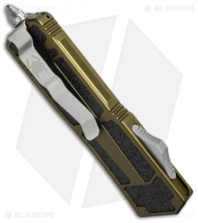 This Scarab has a drop point blade with a plain cutting edge and a stonewash finish. The OD green anodized 6061-T6 aluminum handle has grip inserts on front and back. The hardware, pocket clip and glass breaker are bead blast finished. Model information and Microtech logo on the blade with the Scarab logo on the pocket clip.
