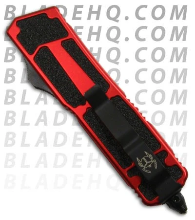 The Microtech Scarab is perhaps the mother of all out-the-front automatic knives. The Scarab is double action meaning is fires both out and in via the slide button located on the right side of the knife. Action, lock-up and quality are all Microtech-top-notch. The Scarab has a black two tone S30-V blade (plain) and gorgeous rich red anodized T-6 aluminum handle. Pocket clip and glass breaker. The screws on this model require the Makora tri-wrench bit.