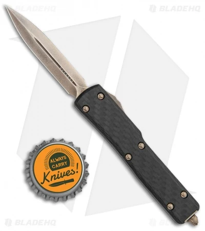 This Microtech UTX-70 sports a bronze apocalyptic finished Damascus blade. The 6061-T6 aluminum handle has bronzed hardware and pocket clip marked with the model and date. Solid out-the-front action comes standard.