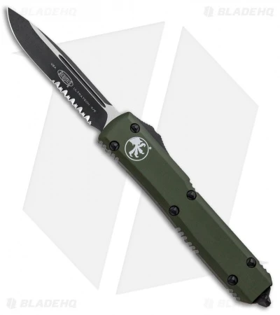 This Ultratech features a drop point blade with a black finish and a partially serrated cutting edge. It has a contoured, OD green anodized 6061-T6 aluminum handle with a black finished pocket clip, glass breaker, and stainless steel hardware.